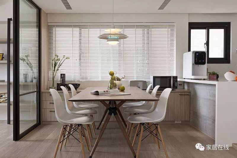 餐厅以原木地板和白色百叶窗来营造温实与自然之调,橱柜造型简单,却足够实用,并与吧台呈T型,组合出简约之范儿;北欧实木餐桌和单椅,让生活充满了简暖感,而白色吊灯与黑色摆饰等,流动着些许时尚。